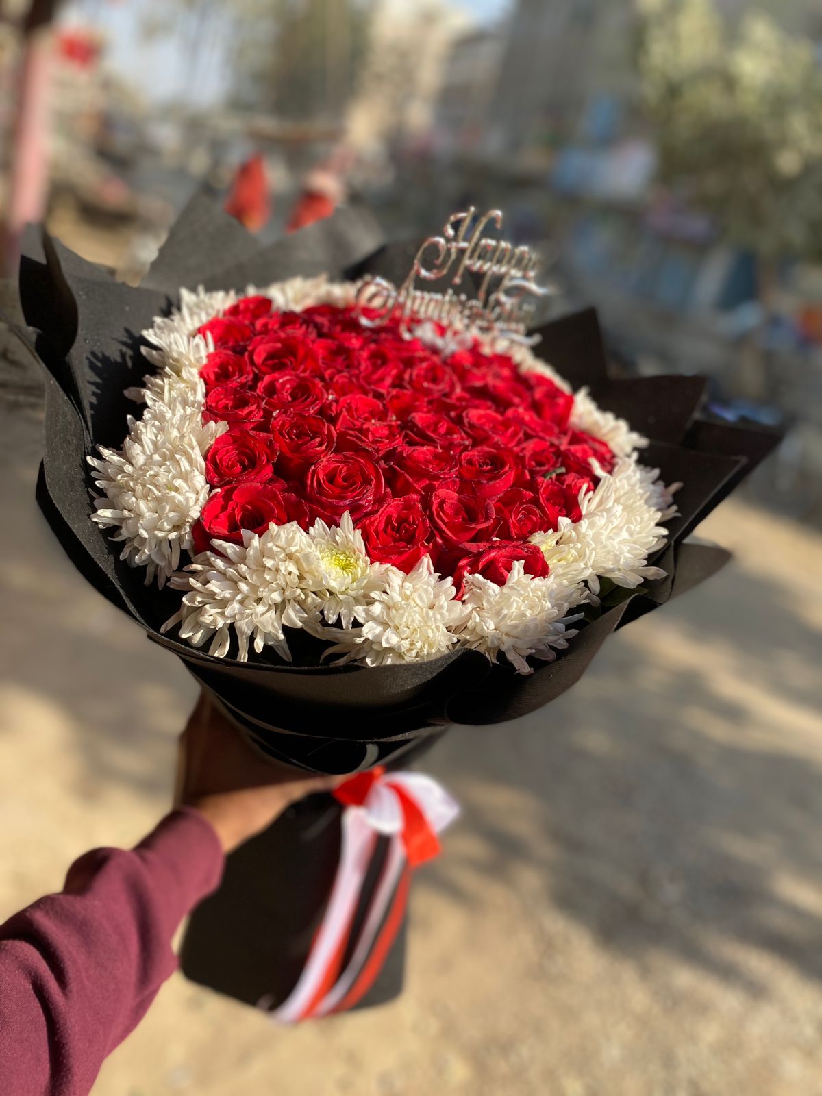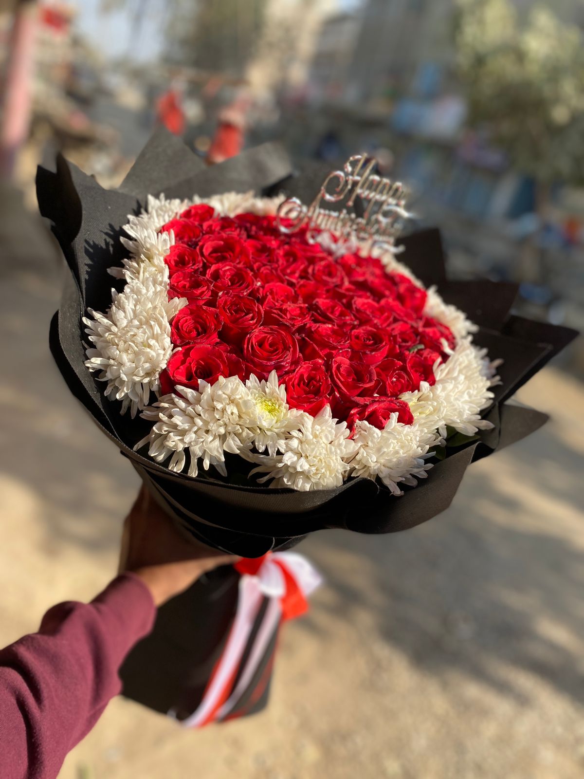 Floral Arrangement: A rich, dense heart of premium Red Roses surrounded by a thick, protective layer of fresh White Chrysanthemums (Gul-e-Daudi).